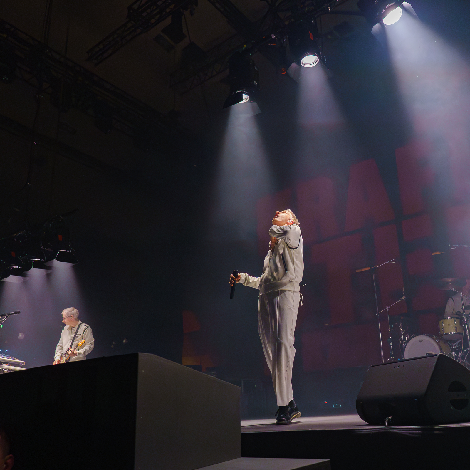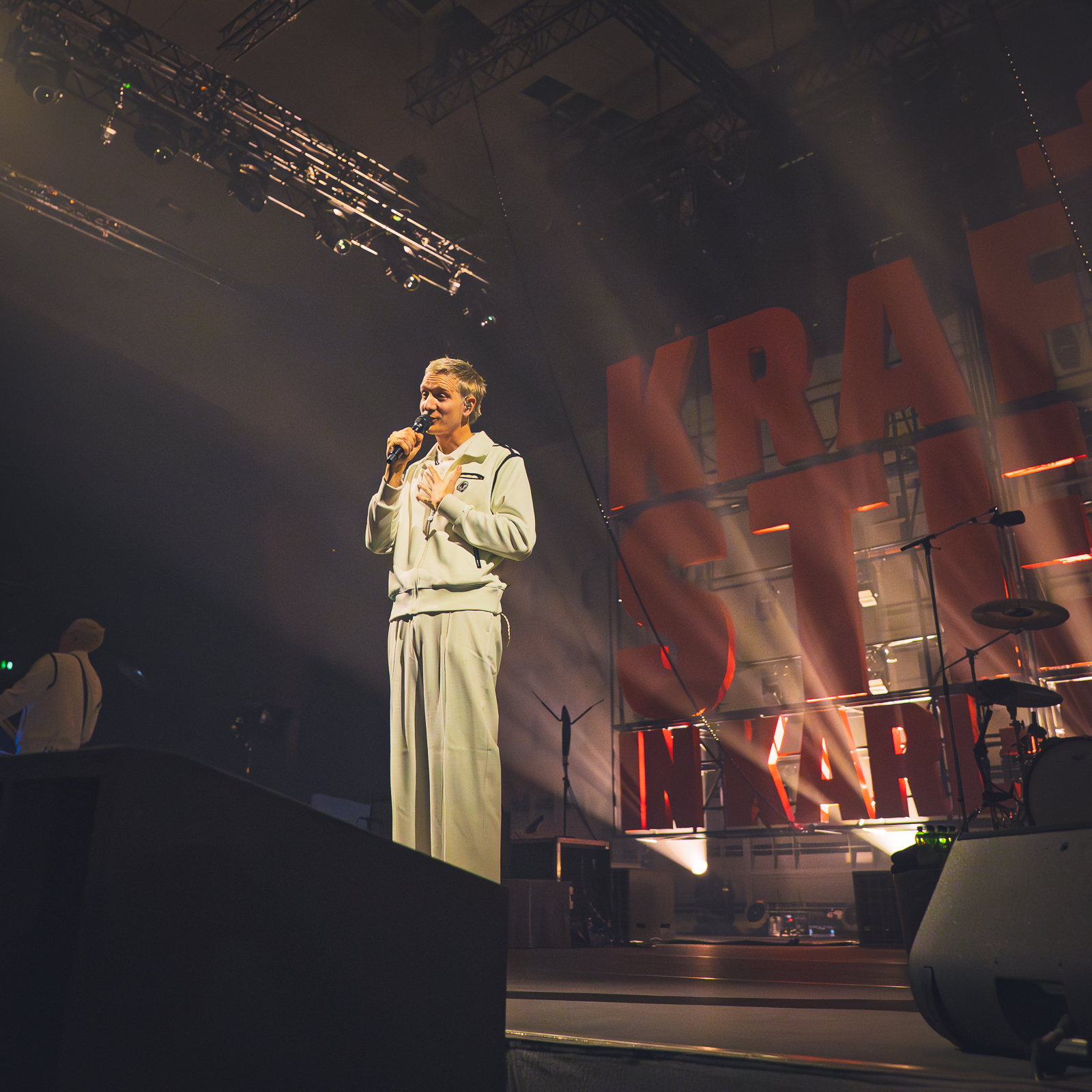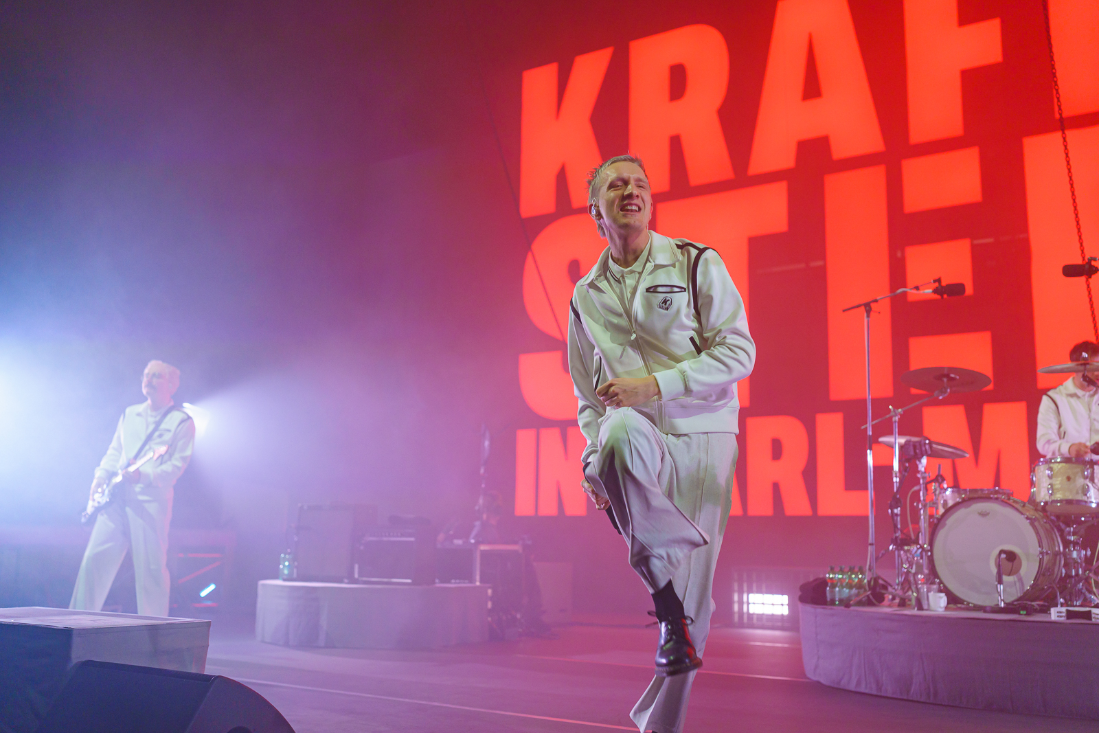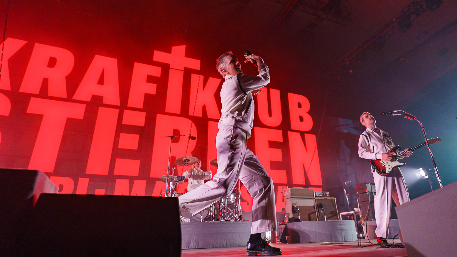 Gewisse Umstände zur Klärung der Fotoberechtigung führten dazu, dass ich von Shelter Boy akustisch leider nicht viel mitbekommen und noch weniger gesehen habe. Nach einer gefühlt sehr kurzen Umbau-Pause ging es direkt los mit einer in schlichtem Rot gehaltenen Bühne und satten Konfetti-/Gebläse-Kombination begleitet vom dystopisch wirkenden Marlboro-Mann. Die Menschen auf und vor der Bühne glückselig stampfend/tanzend/schreiend. Mir lief ein Schauer über den Rücken … unendlich dankbar dafür das alles in der Form erleben zu dürfen, einigermaßen gesund und begleitet von tollen Menschen.
