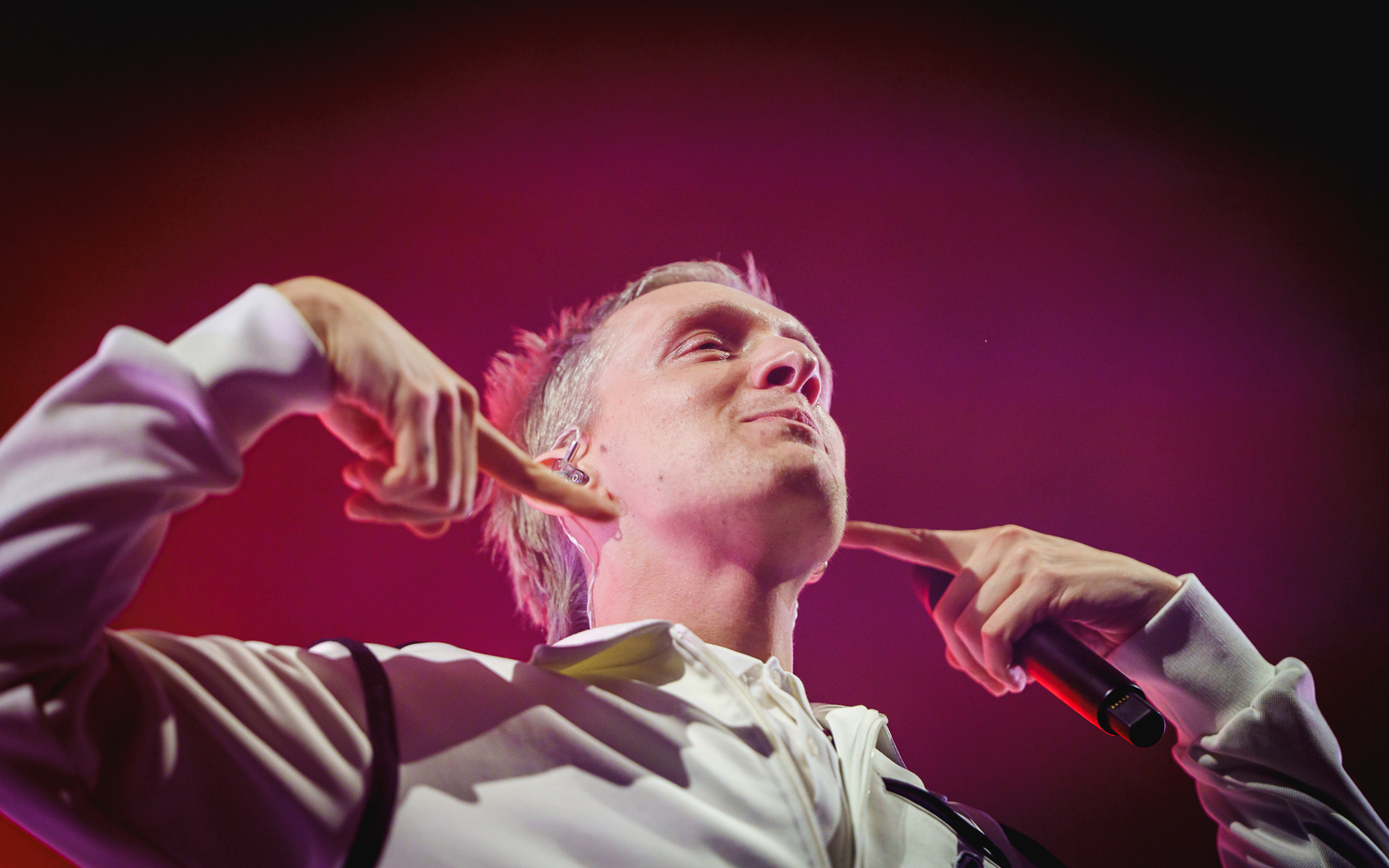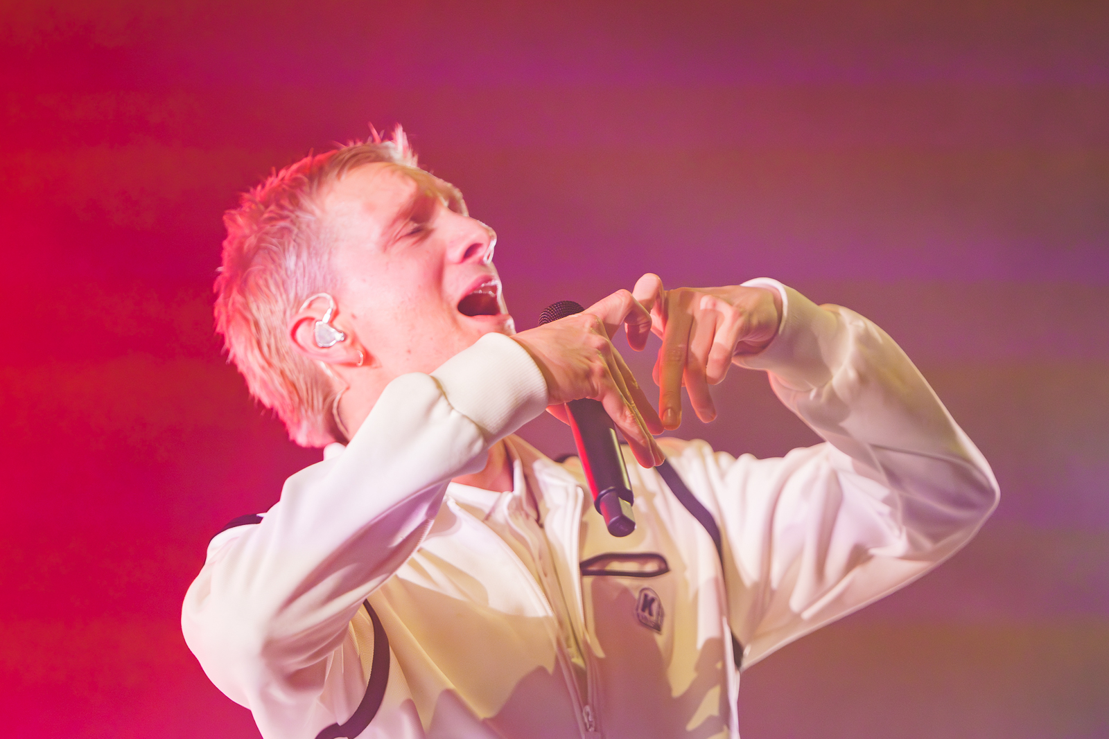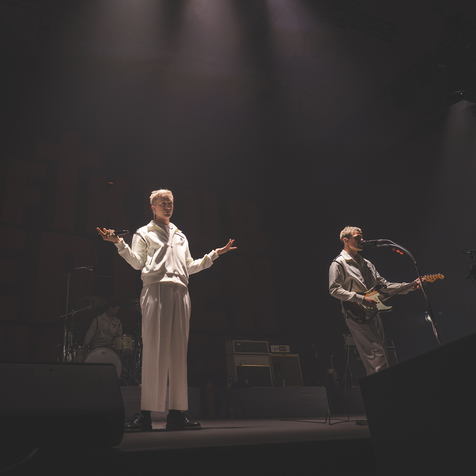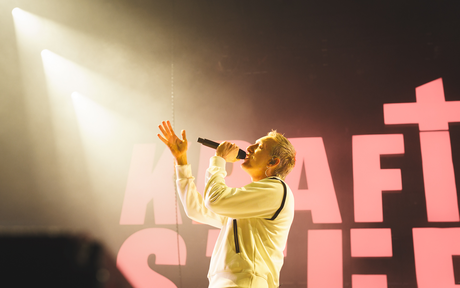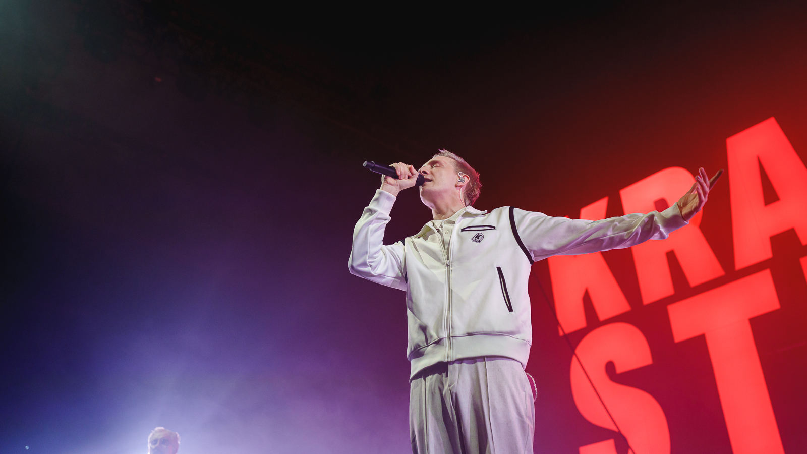 Gewisse Umstände zur Klärung der Fotoberechtigung führten dazu, dass ich von Shelter Boy akustisch leider nicht viel mitbekommen und noch weniger gesehen habe. Nach einer gefühlt sehr kurzen Umbau-Pause ging es direkt los mit einer in schlichtem Rot gehaltenen Bühne und satten Konfetti-/Gebläse-Kombination begleitet vom dystopisch wirkenden Marlboro-Mann. Die Menschen auf und vor der Bühne glückselig stampfend/tanzend/schreiend. Mir lief ein Schauer über den Rücken … unendlich dankbar dafür das alles in der Form erleben zu dürfen, einigermaßen gesund und begleitet von tollen Menschen.