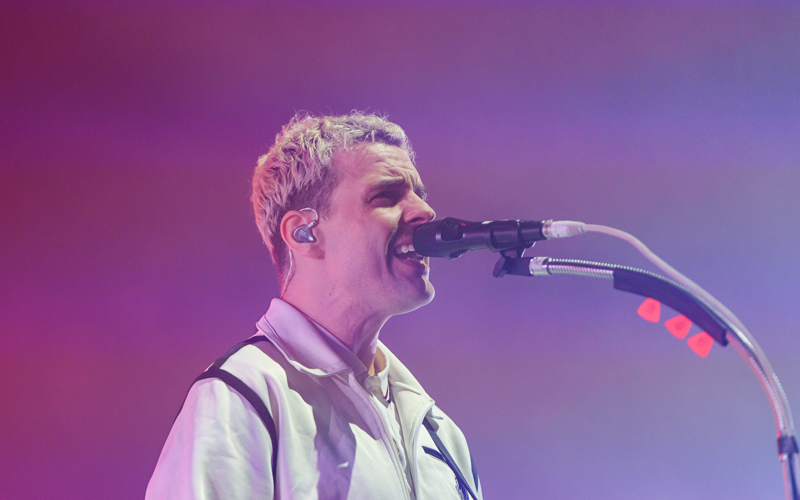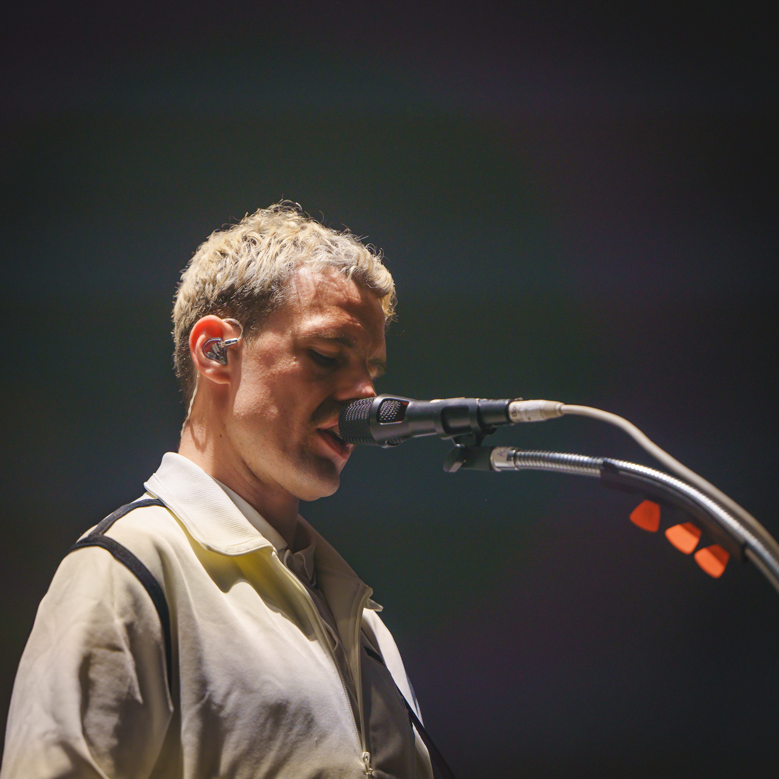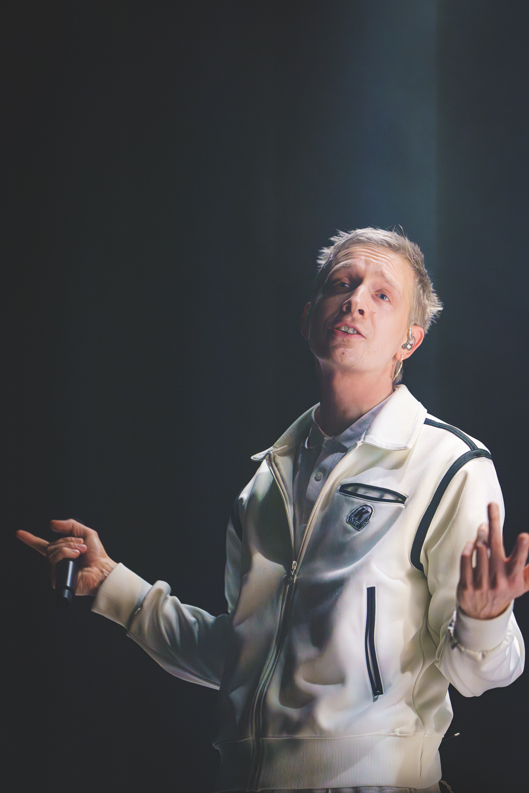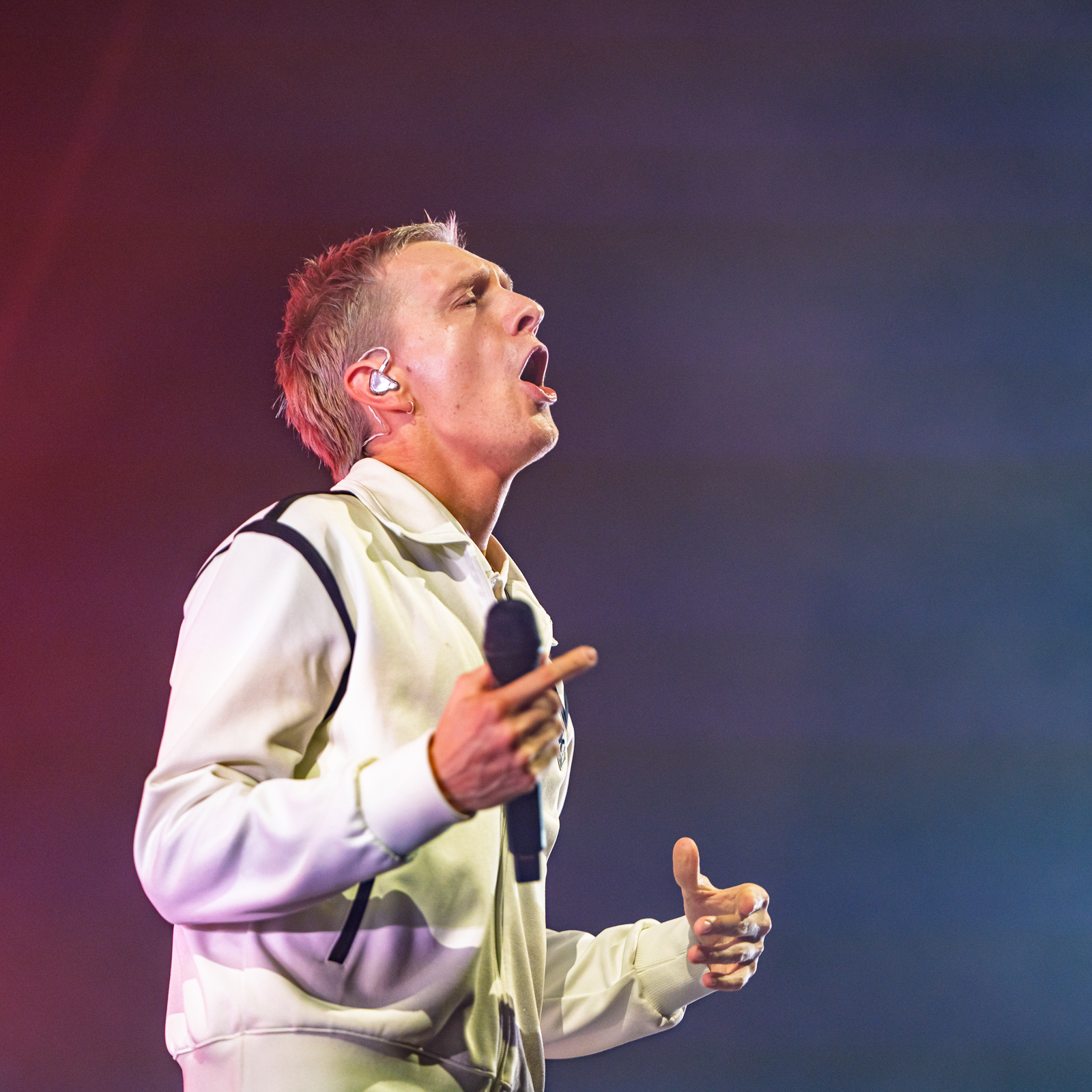 Gewisse Umstände zur Klärung der Fotoberechtigung führten dazu, dass ich von Shelter Boy akustisch leider nicht viel mitbekommen und noch weniger gesehen habe. Nach einer gefühlt sehr kurzen Umbau-Pause ging es direkt los mit einer in schlichtem Rot gehaltenen Bühne und satten Konfetti-/Gebläse-Kombination begleitet vom dystopisch wirkenden Marlboro-Mann. Die Menschen auf und vor der Bühne glückselig stampfend/tanzend/schreiend. Mir lief ein Schauer über den Rücken … unendlich dankbar dafür das alles in der Form erleben zu dürfen, einigermaßen gesund und begleitet von tollen Menschen.
